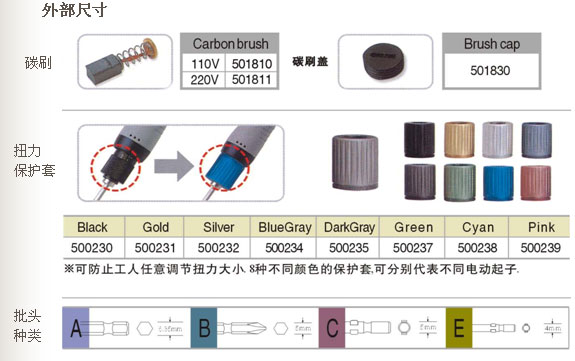 1.标准零件-电动螺丝刀,碳刷,批头2种(各1个),使用说明书;